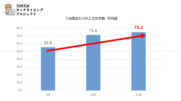 プロジェクトの成果として、クラス全体の1分間あたりの入力文字数の平均値が実証開始月には55.8文字だったのが75.2文字となり、3か月間で19.4文字アップ。入力文字数の分布を見ても、クラス全体でタイピングスキルの向上、底上げがされたという結果を得ることができました。