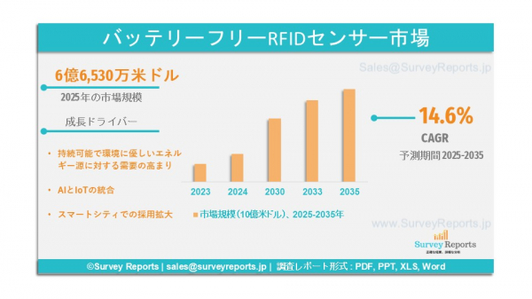 Survey Reports LLCは、2025年5月に「バッテリー不要RFIDセンサー市場セグメンテーション:周波数別(低周波、高周波、超高周波);センサータイプ別(温度センサー、湿度/水分センサー、圧力センサー、動作・位置センサー、光センサー、その他);産業別(自動車、物流、医療、石油・ガス、 食品・飲料、IT・通信、その他)、技術別(パッシブRFIDセンサー、セミパッシブRFIDセンサー)、データインターフェースタイプ別(NFC、Bluetooth、WiFi)、用途別(食品品質監視、状態監視、構造健全性監視)- グローバル市場分析、動向、機会、予測(2025-2035年)を発行しました。この報告書は、バッテリー不要RFIDセンサー市場の予測評価を提供しています。本レポートでは、バッテリー不要型RFIDセンサー市場における主要な市場動向、成長要因、市場機会、課題、および脅威を強調しています。
