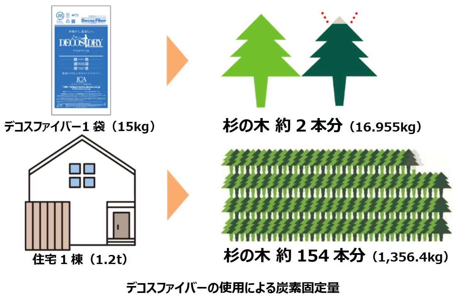デコスファイバーは再生新聞紙を原料の約80%に使用しており、木材由来の炭素固定材としての役割を担っています。紙製品の炭素含有率は35%とされ、デコスファイバー1袋(15kg)で16.955kgの炭素固定が可能、住宅1棟あたりでは1,356.4kgの固定量、40年生杉の木154.13本分の年間CO2固定量に相当します。今後も、木造建築の推進とともに、断熱材による炭素固定の可能性を提案してまいります。