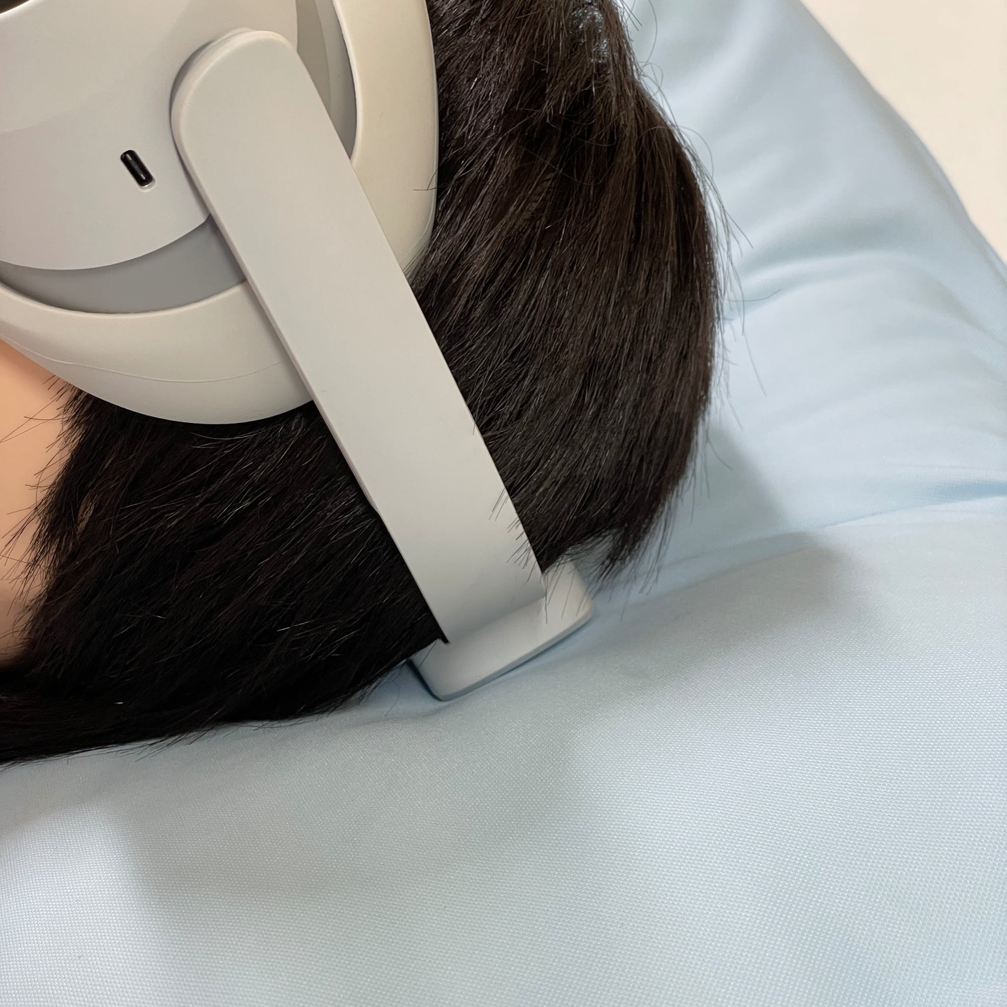 HMDを装着した状態で横向きに寝ると、多くの場合、重みで頭部ストラップが引っ張られ、HMDのズレなどが生じやすくなります。寝心地もよいものではありません。「Your Side」では、まくらの両端にせり上がりを設け、HMDを預けるような姿勢で、この問題を緩和。そのほかにも、傾斜や凹み、詰め物の沈み込みなどを利用し、ご自身のベストポジションを探すことができます。