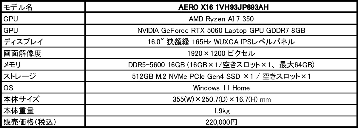 2025年5月30日 - GIGABYTE Technology Co., Ltd. 台湾・新北市 - コンピュータテクノロジーで世界をリードするGIGABYTE Technologyは、AMDの最新ノートPC用プロセッサであるAMD Ryzen AI 7 350と、NVIDIAの最新GPUであるNVIDIA GeForce RTX 5060を搭載した、薄型・軽量の16.0型AIノートPC「GIGABYTE AERO X16 1VH93JP893AH」をノートPC直販サイト「GIGABYTEストア【公式】」を通して5月31日より販売を開始いたします。販売価格(税込)は、220,000円です。