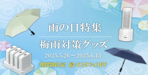 本キャンペーンでは、梅雨時に活躍する「傘」および「除湿器」を対象に、最大55%OFFとなる特別価格でご提供。通勤・通学時に便利な自動開閉傘や、省スペースでパワフルな除湿機など、快適な梅雨生活をサポートするアイテムを豊富に取り揃えております。