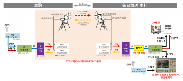 今回の検証実験では、メディアリンクス社製のIP伝送装置(以下、MDP3020 SFN)を使用し、16.6km離れた生駒山から毎日放送本社へ、PTPと放送TSを伝送しました。放送TS信号をMDP3020 SFNでSMPTE ST2022-2(*5)に準拠したIPパケットにして伝送、PTPはセイコーソリューションズ社製のPTPグランドマスタークロック(TS-2910)で、Default profile(IEEE1588v2(*6))に準拠したPTP にて伝送しています。伝送路には、国際電気社製の7GHz帯、10GHz帯FPU(FR15-ZS200)を2対向使用し、双方向にTS伝送可能な回線をマイクロ波で構築しました。FPUのTS入出力をIPに変換するための装置(IPoverTS(*7))は、アストロデザイン社製のCX-5548Aを使用しました。PTP伝送に対応した特殊な機器ではなく、汎用的な機器を使用して、FPUによるIP回線を構築しました。