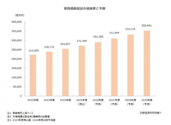 2024年度の家賃債務保証市場規模(居住用と事業用の合算値)は、事業者売上高ベースで2,548億5,700万円(前年度比106.7%)まで拡大し、2025年度には2,723億9,000万円(同106.9%)まで拡大する見通しである。