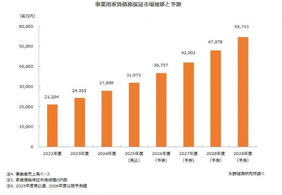 こうした背景から、法人向け物件における事業用家賃債務保証の活用は今後さらに拡大する可能性があり、事業用家賃債務保証市場規模は、2025年度から2029年度までの年平均成長率(CAGR)約 14.4 %で拡大し、2029年度には約547億円に達すると予測する。オーナー(物件所有者)・管理会社双方にとっても、新たな需要の獲得や空室対策として有効な手段になると考える。