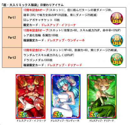 SSレアカードや豪華なアイテムが手に入る「12周年記念福袋ガチャ」が、3日間限定で登場いたします。この「12周年記念福袋ガチャ」は3日間日替わりで、お一人様1日1回限定で購入することができ、3日間合計で最大3回購入できます。