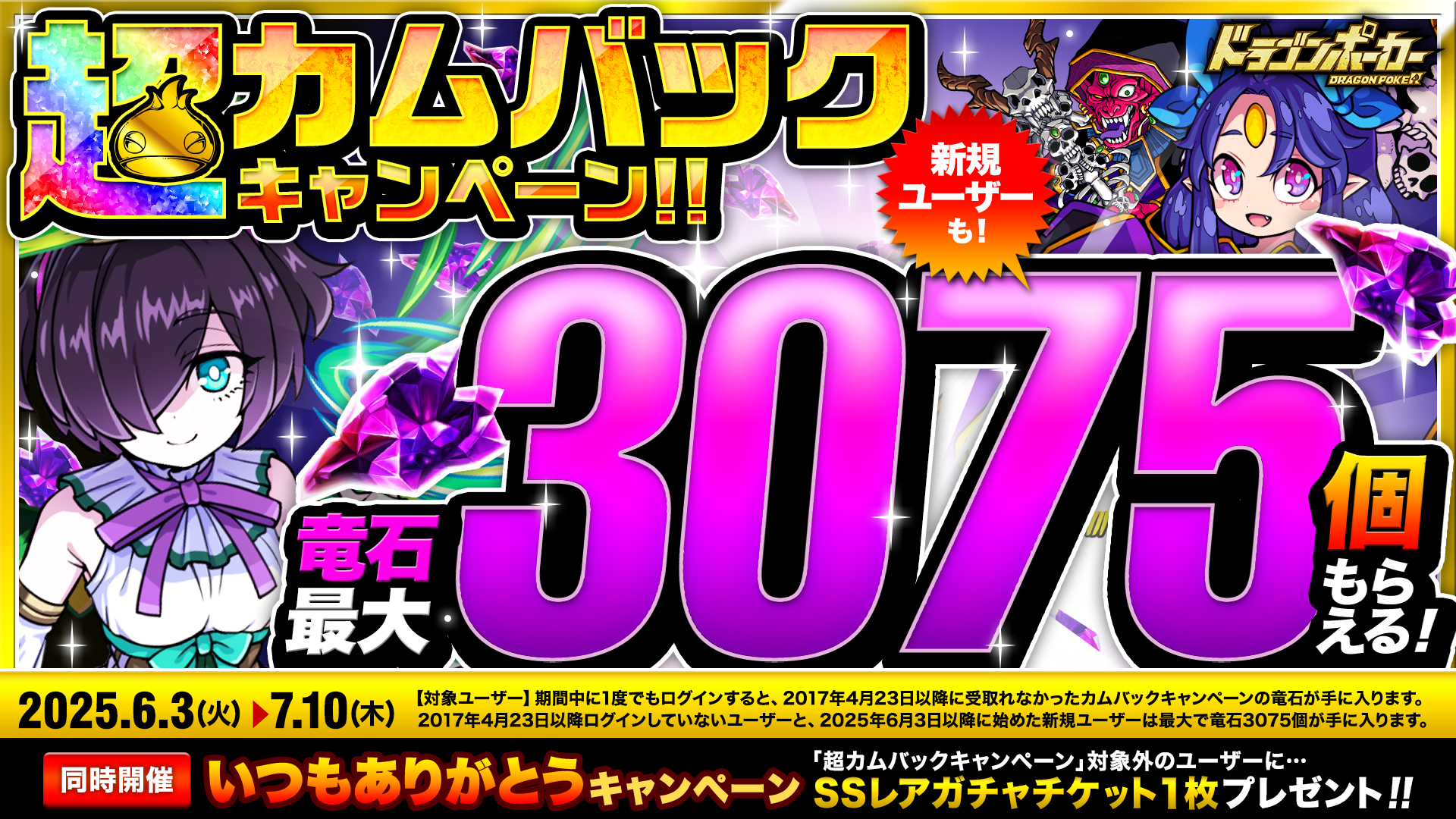 2017年4月23日以降に実施されたカムバックキャンペーンにて、ログインせずに受取れなかった竜石がまとめて手に入ります。2017年4月23日以降のカムバックキャンペーン期間中、ログインしていないユーザーに、最大で竜石3075個をプレゼント!さらに、2025年6月3日以降にドラゴンポーカーを始めたユーザーにも竜石3075個プレゼント!これを機会に、ドラゴンポーカーにログインして大量の竜石をGETしましょう!また、いつも『ドラゴンポーカー』をプレイして頂いているユーザーの皆様には「SSレアガチャチケット1枚」プレゼントいたします。