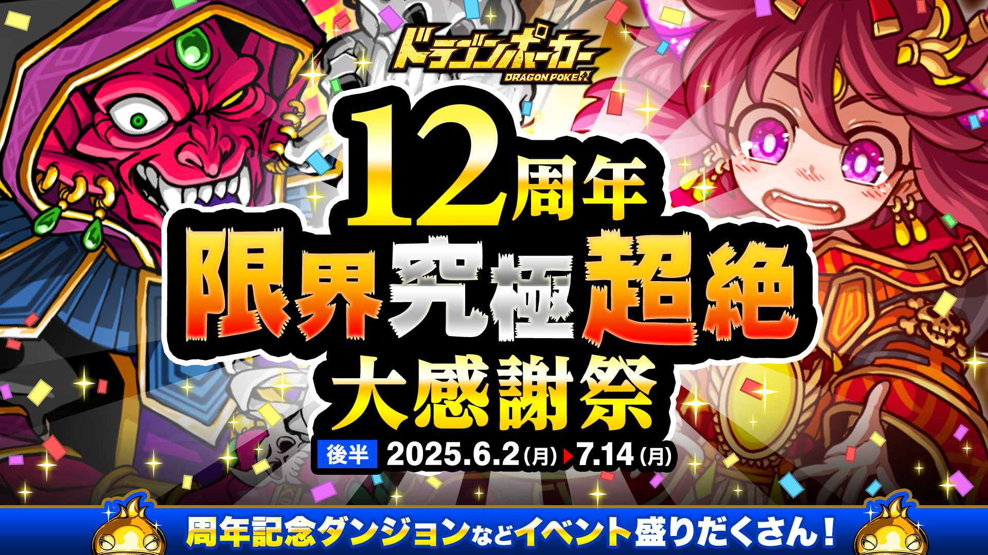 おかげさまで『ドラゴンポーカー』は、2025年5月17日(土)にサービス開始12周年を迎えました。これを記念し、6月2日(月)より「12周年限界究極超絶大感謝祭(後半)」を開催いたします。前半に引き続き、毎週末SSレアガチャチケットがもらえる「12周年記念週末お楽しみプレゼント」や「12周年記念ログインキャンペーン」に加え、「12周年記念福袋ガチャ」なども開催いたします。「12周年限界究極超絶大感謝祭(後半)」もどうぞお楽しみください!