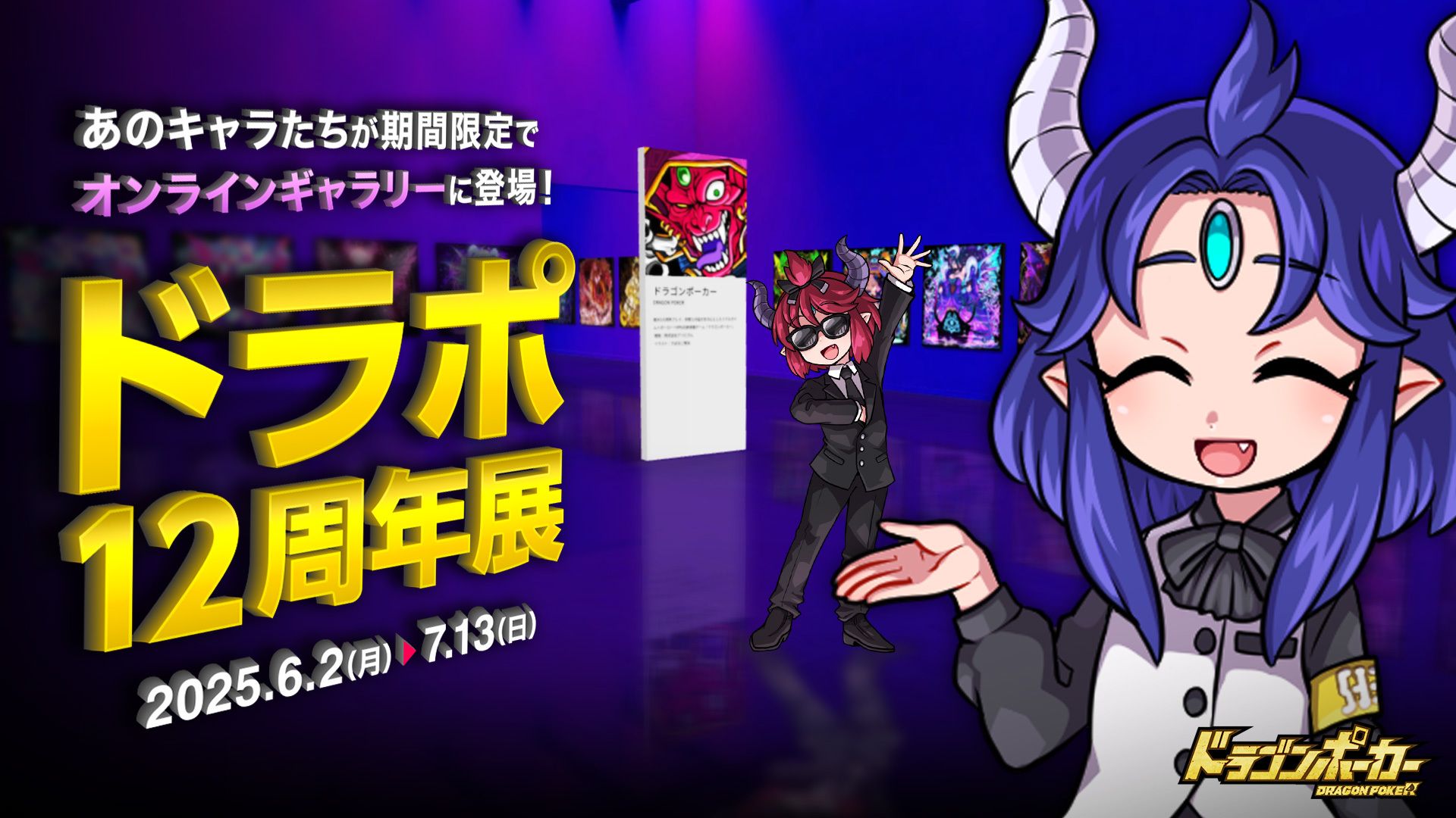 3Dバーチャルギャラリー「ギャラリスト3D」にて、初のオンラインギャラリーを開催いたします。これまでにゲーム内に登場した中から、種族「女の子」「悪魔」「邪神」のキャラクターの一部を展示!最近登場したあのキャラや懐かしのあのキャラなど、ゲーム内では確認がむずかしい細かな部分まで『ドラゴンポーカー』のキャライラストをご覧いただくことができます。ぜひお楽しみください!