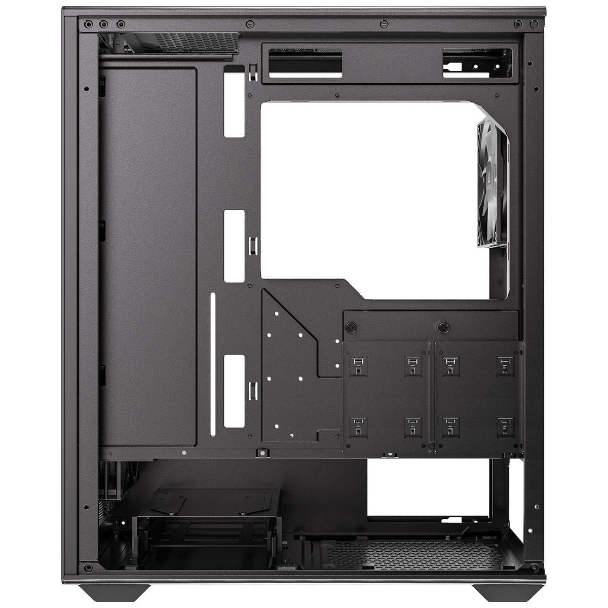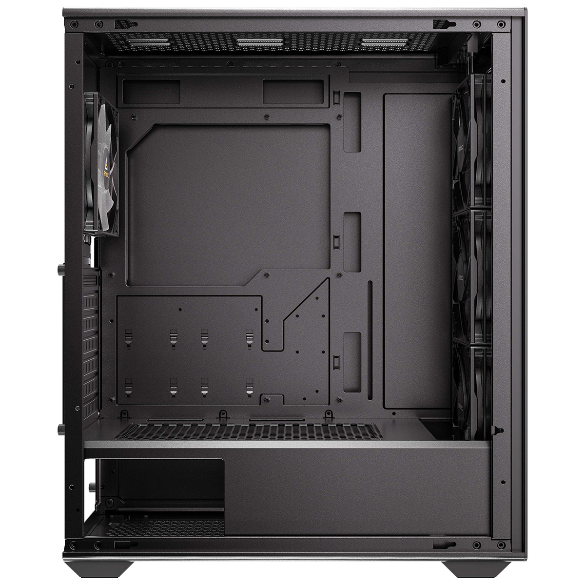 トップ、PSUシュラウド、フロント、リアに最大で8個の120 mmファンを同時搭載でき、最大360 mmのラジエータをフロントに搭載可能です。