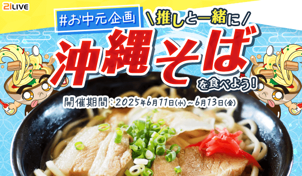 株式会社エムアンドティーティー(本社:沖縄県北谷町、代表取締役:井藤 三知子)が運営するエンターテイメント・ライブ配信アプリ【21LIVE(ニーイチライブ)】URL: https://21.live では、6月11日(水)より『#お中元企画 推しと一緒に沖縄そばを食べよう!』を開催いたします。