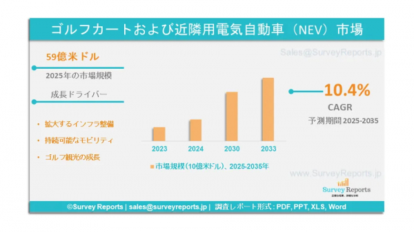 Survey Reports LLCは、2025年6月に「ゴルフカートおよび近隣電気自動車(NEV)市場セグメンテーション:推進方式別(ガソリンエンジン、電気式);タイプ別(近隣電気自動車、ゴルフカート);用途別(レクリエーション、通勤、商業/産業、レジャー・レクリエーション、住宅・郊外利用)」に関する調査報告書を発行しました。電源別(電気式、ハイブリッド、燃料電池、バッテリー式);バッテリータイプ別(鉛酸、リチウムイオン、その他);価格帯別(エントリーレベル、ミドルレンジ、ハイエンド);乗車定員別(2人乗りモデル、4人乗りモデル、6人以上乗りモデル);カスタマイズオプション別(標準機能、ラグジュアリー/プレミアム機能、 性能向上、アクセサリーおよび追加装備);用途別(ゴルフ場、公園、観光施設およびホテル、空港、住宅、商業施設、その他);最終ユーザー別(個人消費者、企業、政府機関、レンタルサービス、教育機関) - 2025年から2035年までのグローバル市場分析、動向、機会、予測。ゴルフカートおよび近隣用電気自動車(NEV)市場の予測評価を提供します。このレポートでは、ゴルフカートおよび近隣用電気自動車(NEV)市場における成長要因、市場機会、課題、脅威を含む、複数の主要な市場動向を強調しています。