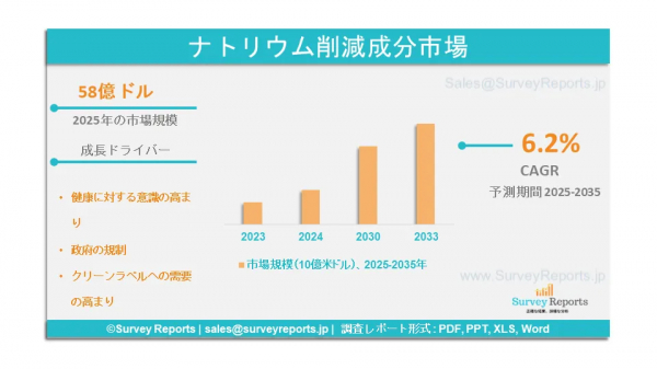 Survey Reports LLCは、2025年6月に「ナトリウム削減原料市場セグメンテーション(タイプ別:アミノ酸、ミネラル塩、酵母エキス、グルタミン酸塩、高ヌクレオチド原料、加水分解植物タンパク質、その他);用途別(ベーカリー・菓子、乳製品・冷凍食品、甘味・塩味スナック、肉、水産物・家禽、 スープ、ドレッシング・サラダ、その他);販売チャネル別(スーパーマーケット・ハイパーマーケット、オンライン小売、専門店、食品サービス、直接販売、その他)-グローバル市場分析、動向、機会、予測(2025-2035年)を発行しました。この報告書は、ナトリウム削減原料市場の予測評価を提供しています。本レポートでは、ナトリウム削減原料市場における成長要因、市場機会、課題、脅威を含む、複数の主要な市場動向を強調しています。