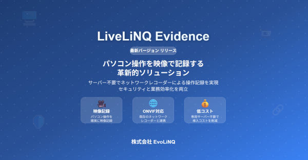 株式会社EvoLiNQ(本社:富山県富山市、代表取締役:冨成敬之)は、パソコン操作を映像で記録するソフトウェア「LiveLiNQ Evidence」の最新バージョンをリリースしたことを発表いたします。