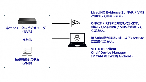 LiveLiNQ Evidenceは、監視カメラで広く使われるONVIF/RTSPプロトコルに対応し、従来の同種製品で必要とされる専用サーバーを不要とする革新的なソリューションです。ネットワークレコーダーがあれば、コストを抑えながらパソコン操作の映像記録が可能となり、セキュリティ強化と業務効率化を同時に実現します。