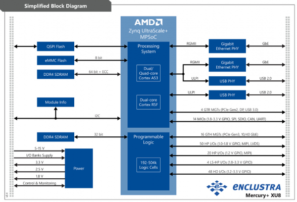 Mercury+ XU8 FPGAモジュールは、AMD ZynqTM UltraScale+TM MPSoCシリーズを中心に据え、下記の要素を一体化した高集積モジュールです: