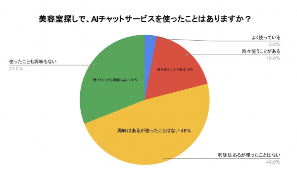 「美容室探しでAIチャットサービスを使ったことはありますか?」のアンケート調査を行ったところ、『よく使っている・時々使うことがある』が21%、『興味はあるが使ったことはない』が48%、『使ったことも興味もない』が31%となり、約2割の人が実際に利用していることがわかりました。また、利用経験はないが興味を持っている人が約半数いることがわかりました。