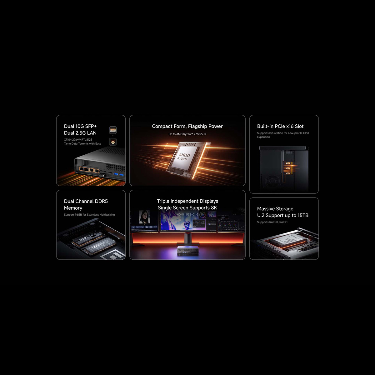 アクセスしやすい本体正面には3つのUSBポートを搭載し、背面には2つの2.5G LANポートに加えてHDMI、USB-C、USB 3.2端子を備えるだけでなく、超高速ネットワーク通信を可能にする10G SFP+端子も2つ搭載しています。