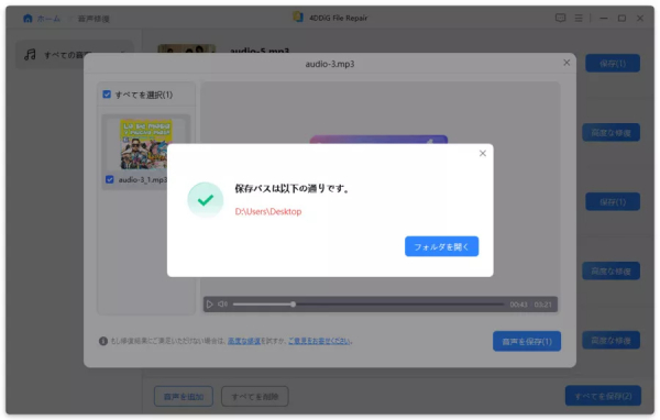 手順3:音声ファイルの修復が完了すると、修復された音声ファイルをプレビューして、指定した場所に保存できます。