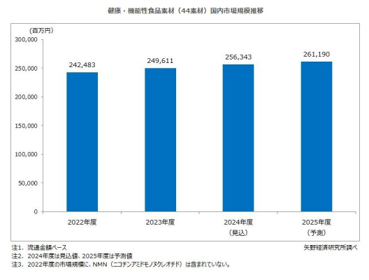 健康食品市場において、紅麹関連商品による健康被害の対象商品が生活習慣病予防の機能性表示食品、打錠であったことから、関連商品や打錠商品など一部への影響は見られた。しかし、健康食品及び健康・機能性食品素材国内市場全体への影響は軽微であり、国内の健康食品市場、健康・機能性食品素材市場は今後も緩やかな成長基調を維持していく見通しである。