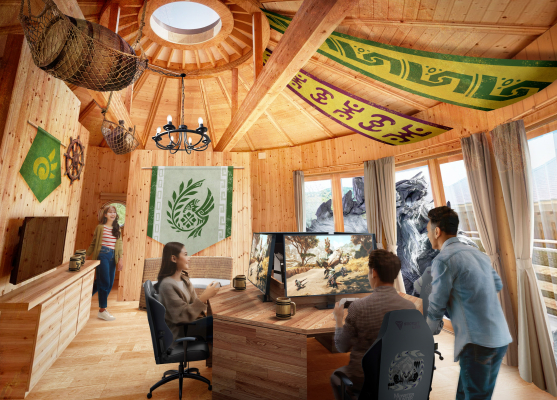 『集会所のコクーン』は、ゲーム内の「集会所」同様、最大4名で宿泊が可能であり、リビングには24.5インチモニターと、Secretlabゲーミングチェア モンハンコラボモデル(※)、Wi-fi、PlayStation 5 Pro等を完備した“ニジゲンノモリスペシャルゲーミングブース”を設置し、ラグジュアリーな宿泊体験とともに、充実した環境でシリーズ最新作『モンスターハンターワイルズ』をプレイすることができる国内唯一の部屋となっております。室内には、ゲーム内に登場する模様がデザインされたインテリアや『モンスターハンターワイルズ』のメインモンスター「アルシュベルド」が出現し、宿泊者を出迎えます。