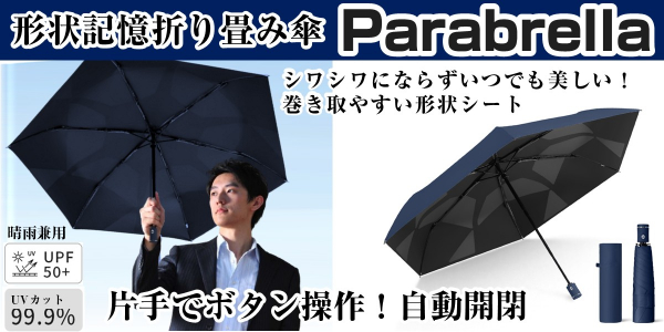 晴雨兼用の折りたたみ傘「Parabrella」は、“使うたびに形が崩れて気になる”という従来の折りたたみ傘の弱点を克服し、傘に“美しさ”という新たな機能を加えた形状記憶シートを採用した新しい傘です。開いても、閉じてもスマートなフォルムを保ち、ビジネスにもカジュアルに馴染むスマートなデザイン。ボタンでワンタッチ自動開閉、収納時は手でシャフトを仕舞うだけの手軽さ。UVカット率99.9%(UPF50+)&遮熱効果により熱中症対策の日傘として活躍。軽量&コンパクト設計で365日常備できる頼れる1本です。