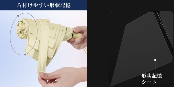 傘布の素材には、柔軟性と耐久性に優れた形状記憶シートを使用。