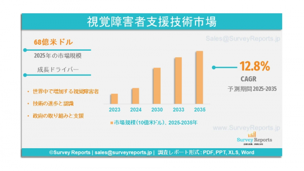 Survey Reports LLC は、2025年6月に「視覚障害者向け支援技術市場セグメンテーション:製品タイプ別(教育用デバイスおよびソフトウェア(点字複写機および点字ライター、点字コンピュータ、数学・科学用デバイス、読書機器、その他)、移動支援デバイス(白杖、その他)、低視力支援デバイス(スマートグラス、VTS Link、拡大レンズ、 その他)、その他(文書ホルダー、モニター、デスク))、エンドユーザータイプ別(盲学校および訓練機関、政府/社会/非営利組織および企業、連盟・病院、個人利用)、個人利用)、流通チャネル別(病院薬局、光学店、オンライン薬局) - 2025年から2035年までのグローバル市場分析、動向、機会、予測。視覚障害者向け支援技術市場の予測評価を提供します。視覚障害者向け支援技術市場の成長要因、市場機会、課題、脅威など、複数の主要な市場動向を強調しています。