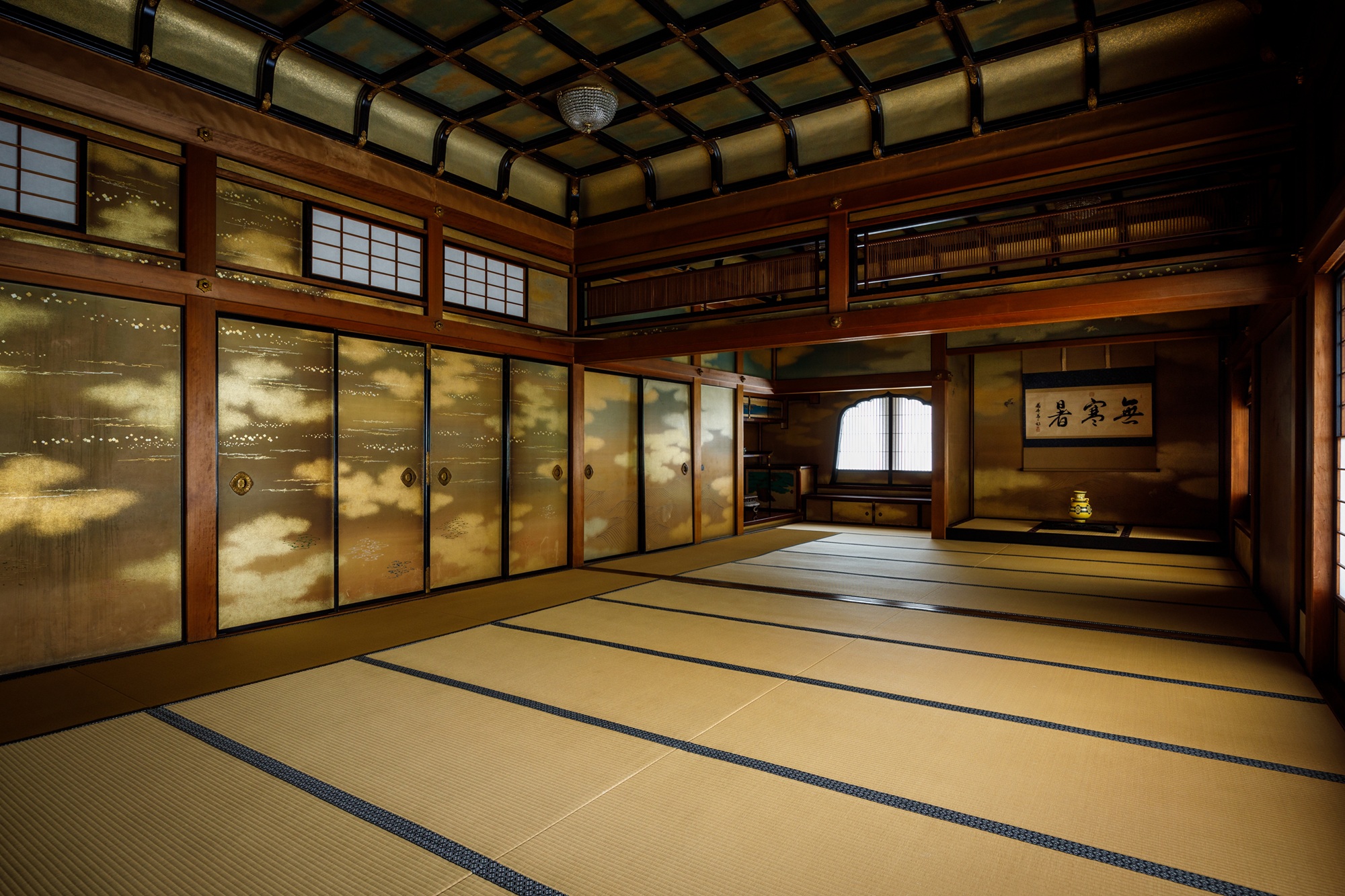 「御成の間」は折上格天井にバカラ社製のシャンデリアを配した書院造の和室。