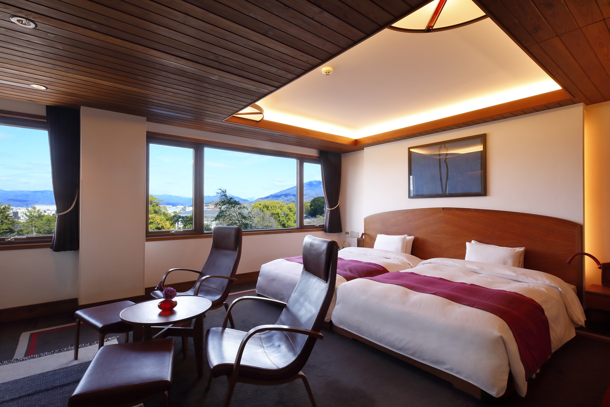 2階・3階の各部屋からは、如意ヶ嶽の「大文字」をはじめ、松ヶ崎の西山・東山に浮かぶ「妙・法」、西賀茂船山の「船形」の送り火をご鑑賞いただけます。