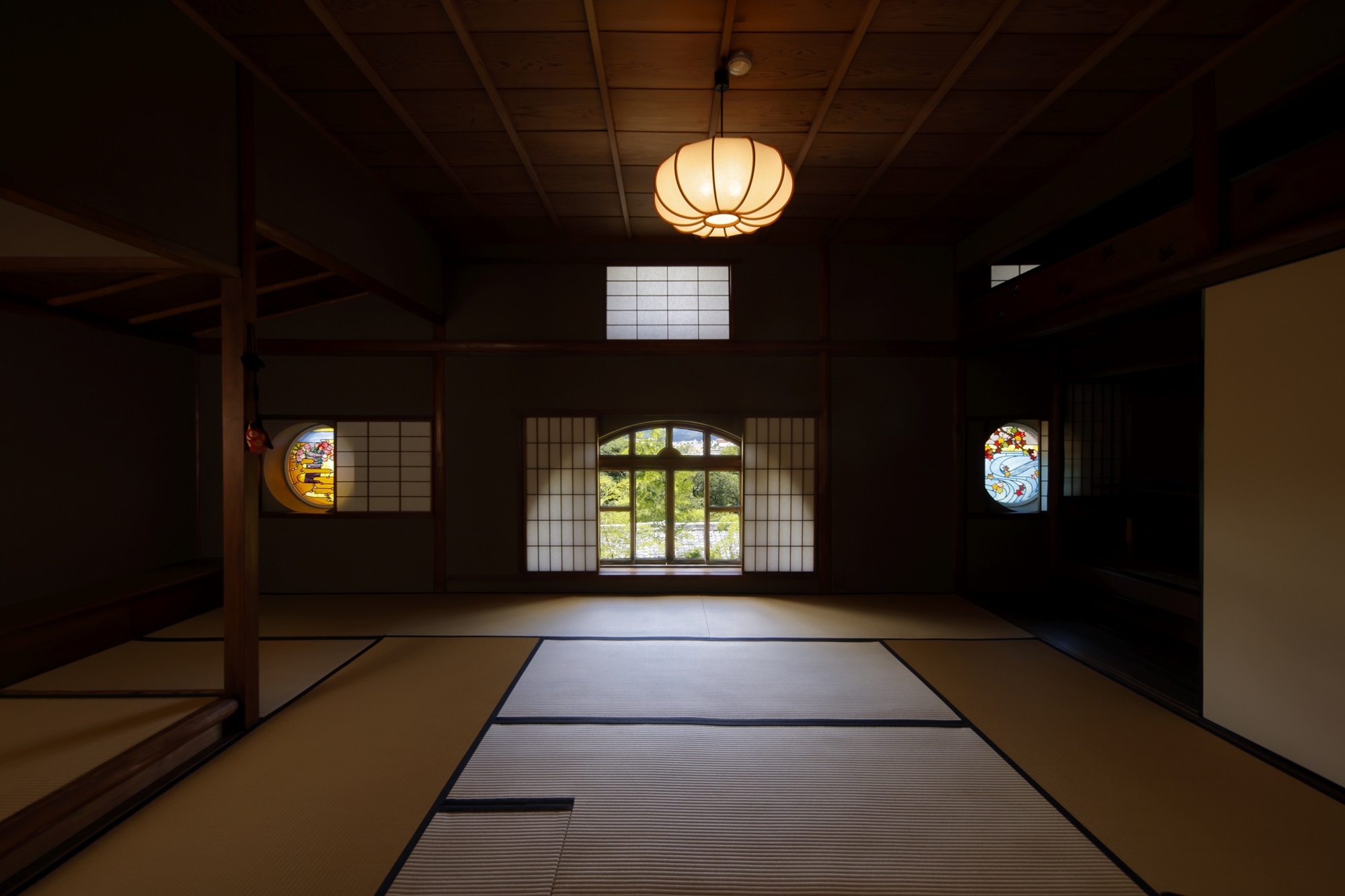 一方、「長楽庵」は表千家の「残月亭」の写しと伝わる茶室で、和柄のステンドグラスが飾られた東洋と西洋の文化が融合した、長楽館ならではの特異な空間です。