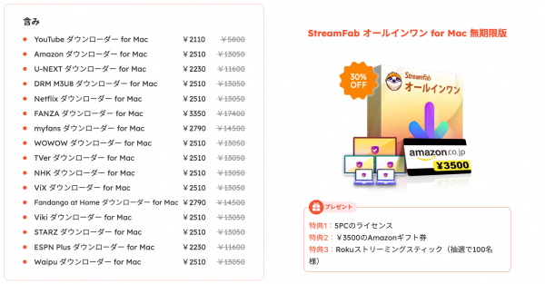 StreamFab YouTube Downloader Proが6,520円(通常11,600円、無期限版)など、最大30%オフで提供されます。