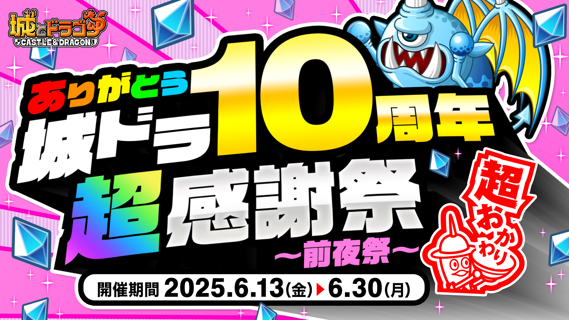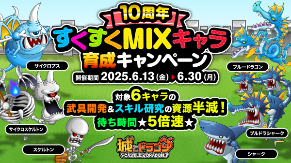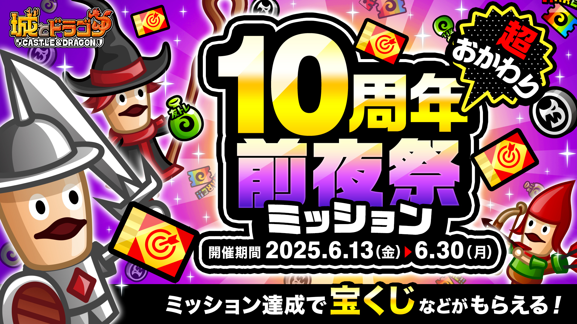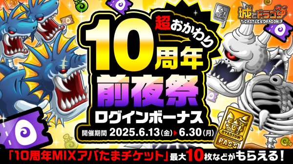 『城とドラゴン』リリース10周年の感謝祭イベントに先駆け、その“前夜祭”として「ありがとう10周年!城ドラ超感謝祭 超おかわり~前夜祭~」を6月13日(金)より開催!「ログインボーナス」では10周年MIXアバたまチケット最大10枚を、「ミッション」では周年イベントでお馴染み「城ドラ宝くじ」を先行で最大5枚を獲得可能!また、過去に登場した「MIXシリーズ」に関連したキャラの育成キャンペーンも開催いたします。