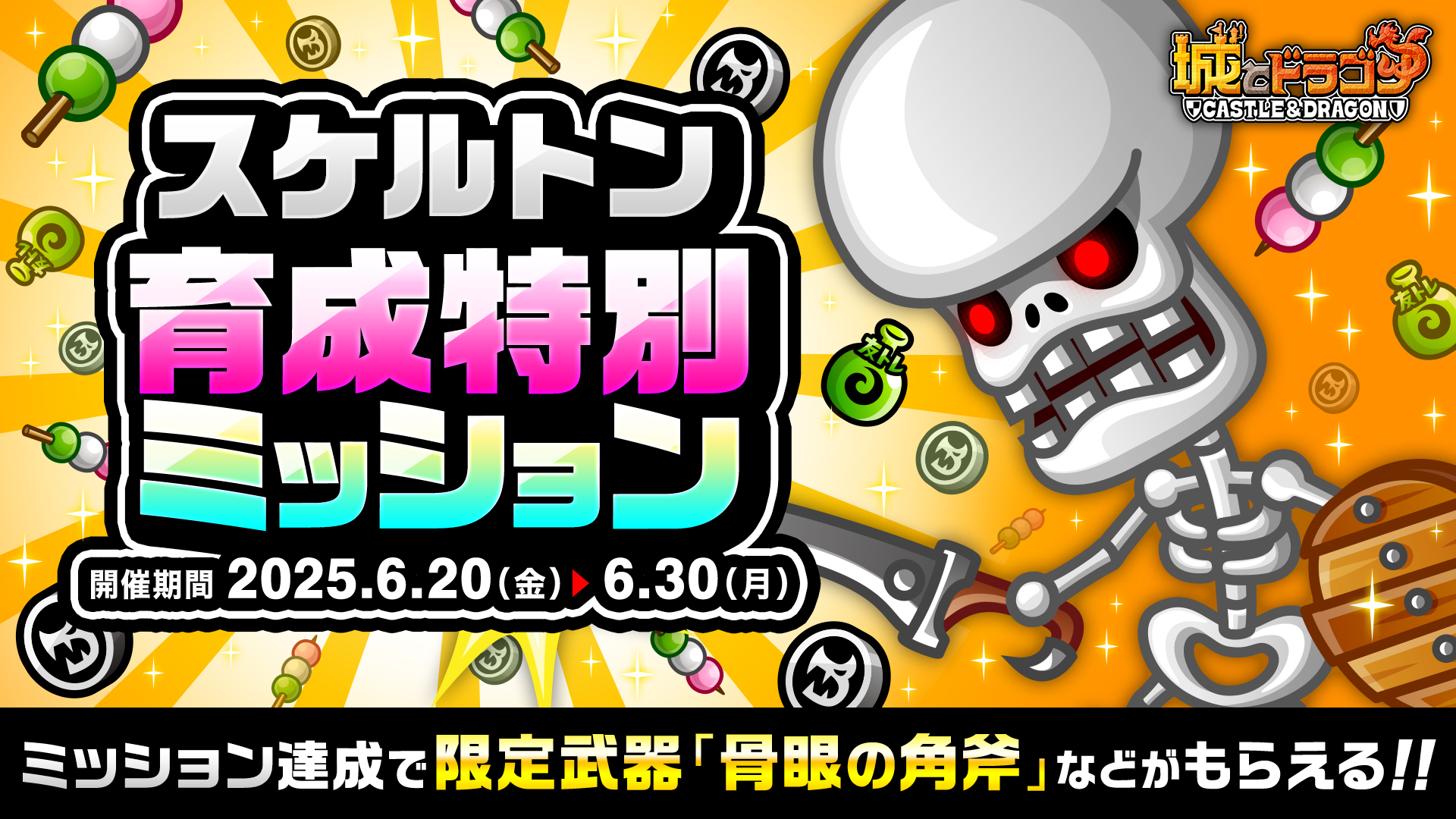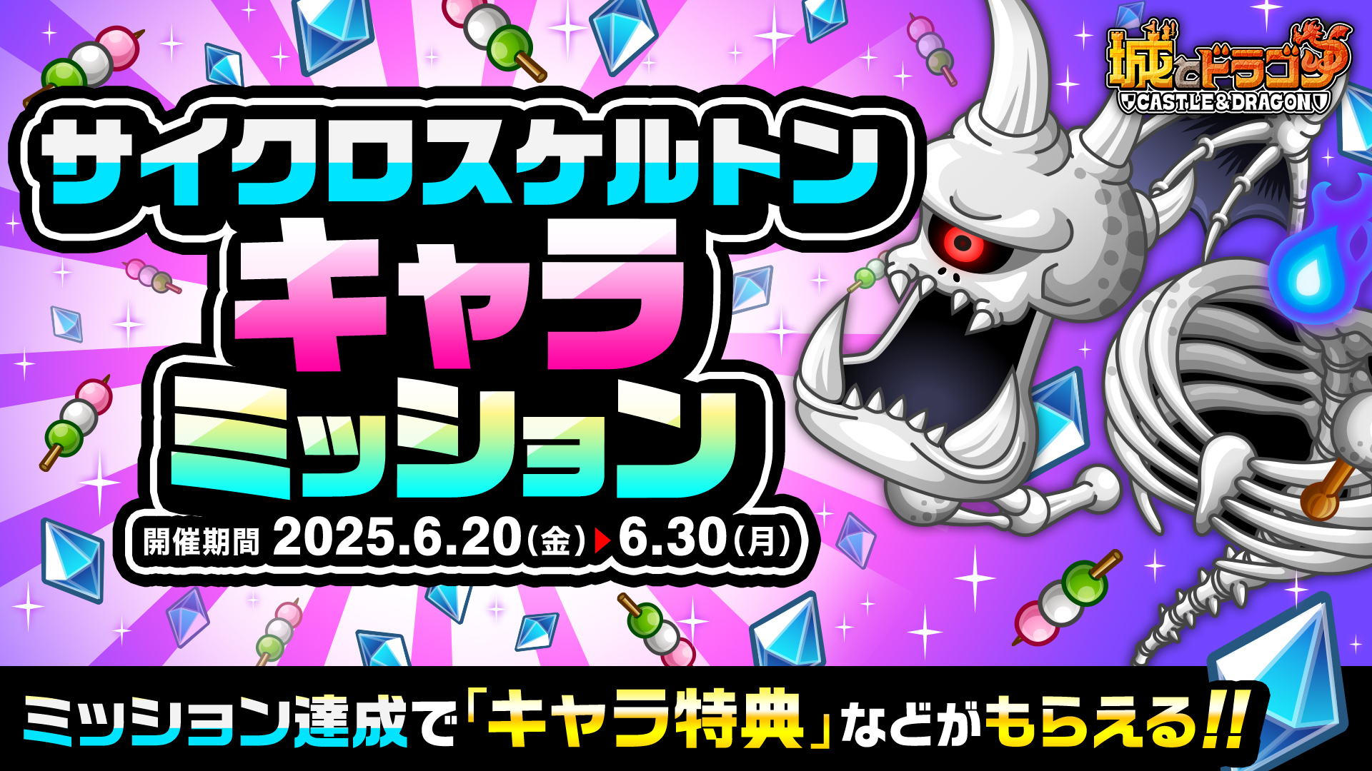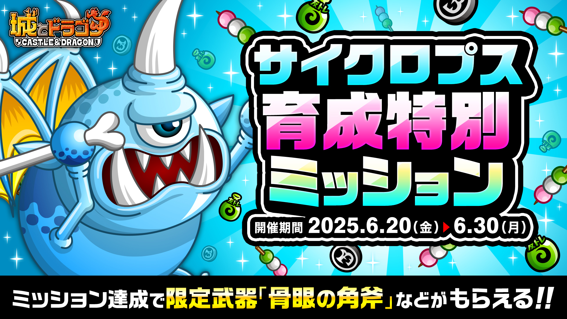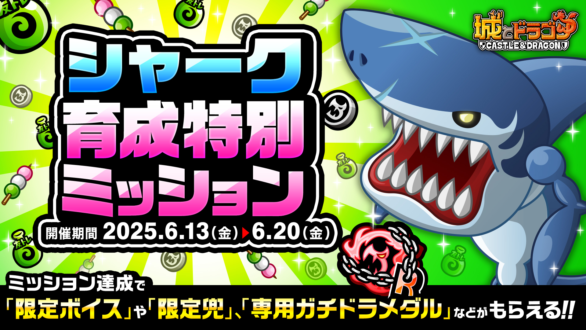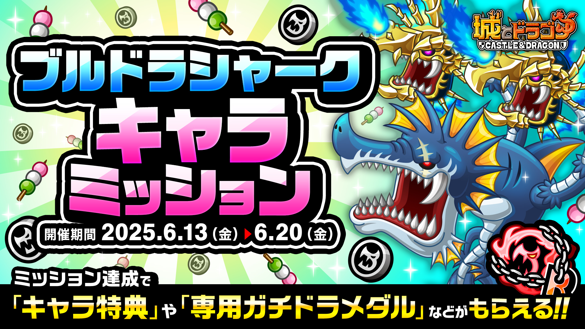 これまでに登場したMIXシリーズや関連キャラにまつわる6つのミッションを開催いたします。ブルードラゴン・シャーク・サイクロプス・スケルトンのミッション限定武具が復刻登場し、入手すると能力のパラメータがわずかに上昇!もちろんブルドラシャークとサイクロスケルトンのキャラ特典も復刻登場いたします。さらに、ブルドラシャークとシャークのミッションからは専用ガチドラメダルも獲得可能!ぜひこの機会にゲットしましょう。
