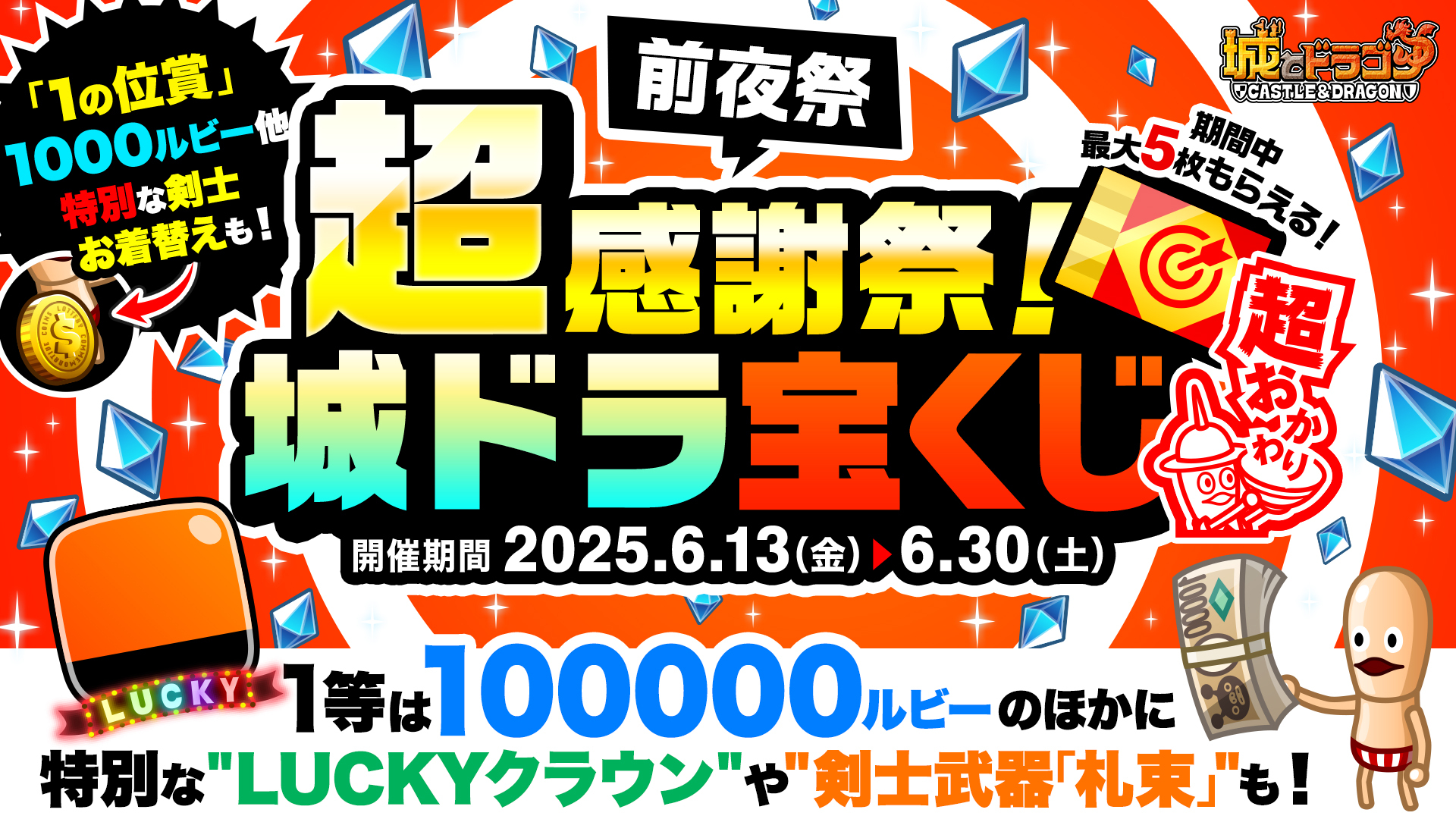 “10周年 前夜祭ミッション 超おかわり”で最大5枚入手できる“宝くじ”で、運試しに挑戦!1等は100,000ルビーのほか、“LUCKYクラウン”や剣士武器「札束」をプレゼント!さらに1の位賞では、1,000ルビーに加えて特別な剣士盾「Bigコイン」をプレゼントいたします。