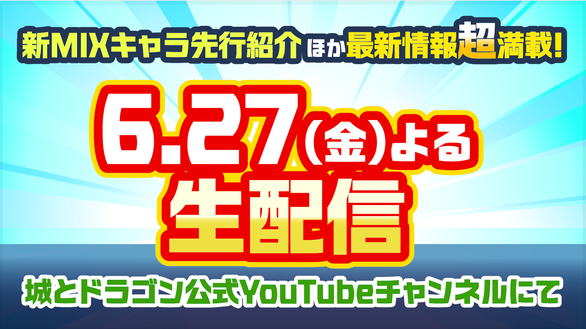 6月27日(金)20:00より『城ドラ』公式YouTubeチャンネルにて生配信が決定!7月に登場する新たなMIXキャラなど、情報盛りだくさんでお届けいたします。こうご期待!