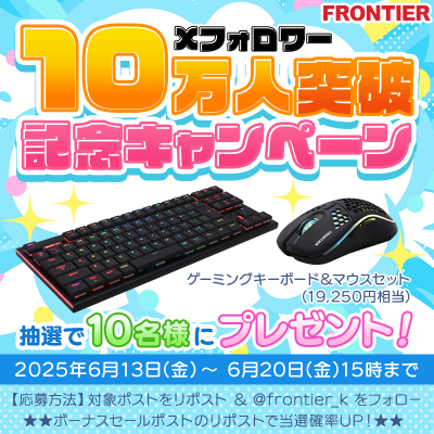 FRONTIER公式Xアカウント(@frontier_k)をフォローし、対象の投稿をリポストしていただいた方の中から、抽選で10名様に「FRONTIERゲーミングキーボード&マウスセット」をプレゼントいたします。