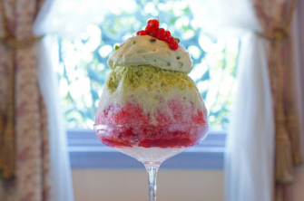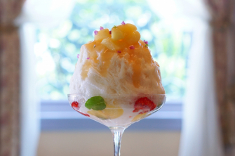 長楽館氷菓は、日本のかき氷とフランス伝統菓子・サバランを組み合わせたオリジナルスイーツです。
