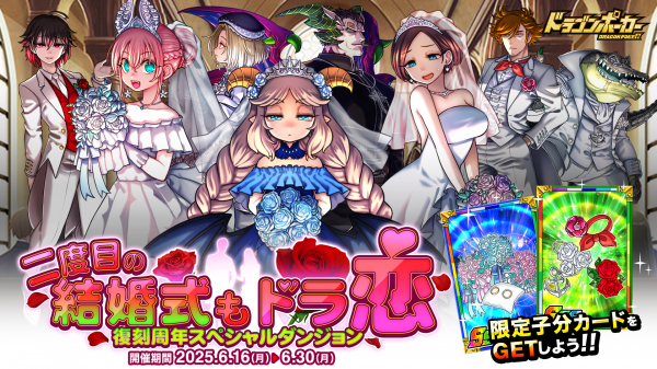 株式会社アソビズム(本社:東京都千代田区、代表取締役:大手智之)は、App Store・Google Playにて好評配信中のリアルタイム合体カードバトル『ドラゴンポーカー』で、2025年6月16日(月)より復刻周年記念スペシャルダンジョン「二度目の結婚式も、ドラ恋」を開催いたします。