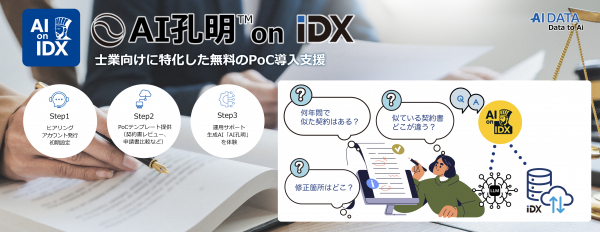 企業データとAIの利活用カンパニー、AIデータ株式会社(本社:東京都港区、代表取締役社長 佐々木隆仁、以下AIデータ社)は、生成AI「AI孔明TM on IDX」の士業向けに特化した無料のPoC導入支援メニューを提供いたします。
