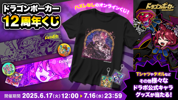 オリジナルオンラインくじを提供するプラットフォーム「AKIBA EDEN LOT」にて、『ドラゴンポーカー』公式グッズが当たる「ドラゴンポーカー12周年くじ」を2025年6月17日(火)12:00より期間限定で開催いたします。ハズレなしのくじとなっておりますので、この機会にぜひチャレンジしてみてください!