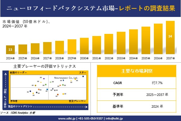 SDKI Analytics(本社:東京都渋谷区)は、このたび、2025年06月17に「ニューロフィードバックシステム市場調査レポート:2025-2037年の市場規模、シェア、傾向の予測」を発表しました。ニューロフィードバックシステムに関する市場調査レポートには、統計的及び分析的アプローチを使用した予測評価が含まれています。この調査レポートでは、一次及び二次調査方法を使用して分析された主要な業界洞察を通じて将来の傾向を理解できるようにすることで、主要な市場動向を読者に説明しています。