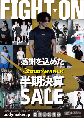 BODYMAKER(ボディメーカー)は、恒例、年に1度のお買得盛りだくさんな「半期決算SALE」を6月20日(金)より9月末日までスタートします。BODYMAKER公式直営サイト及び、直営店舗で、新作・旧作アイテム大放出するお買得セール!また、同時に同タイトルのDMを発行しました。新作ウエア、シューズ、サンダルなど中心に、お買得アイテムを多数掲載。目玉アイテムとして、夏の定番のプリントTシャツ、シューズ、サンダル。一例を紹介すると、各種プリントTシャツ¥4,990→¥1,990の¥3,000引き、bmtwスーパーストレッチTシャツ¥2,990→¥1,990の¥1,000引き、阪神タイガースコラボTシャツ、グッズ第一弾¥1,990→¥990の半額など。今回も送料無料商品を多数あり、お客様がお得な買い物ができるようにBODYMAKER(ボディメーカー)は挑戦します。BODYMAKER公式直営サイト・直営店舗ともにわくわくドキドキ…。ぜひ、一度ご覧ください。