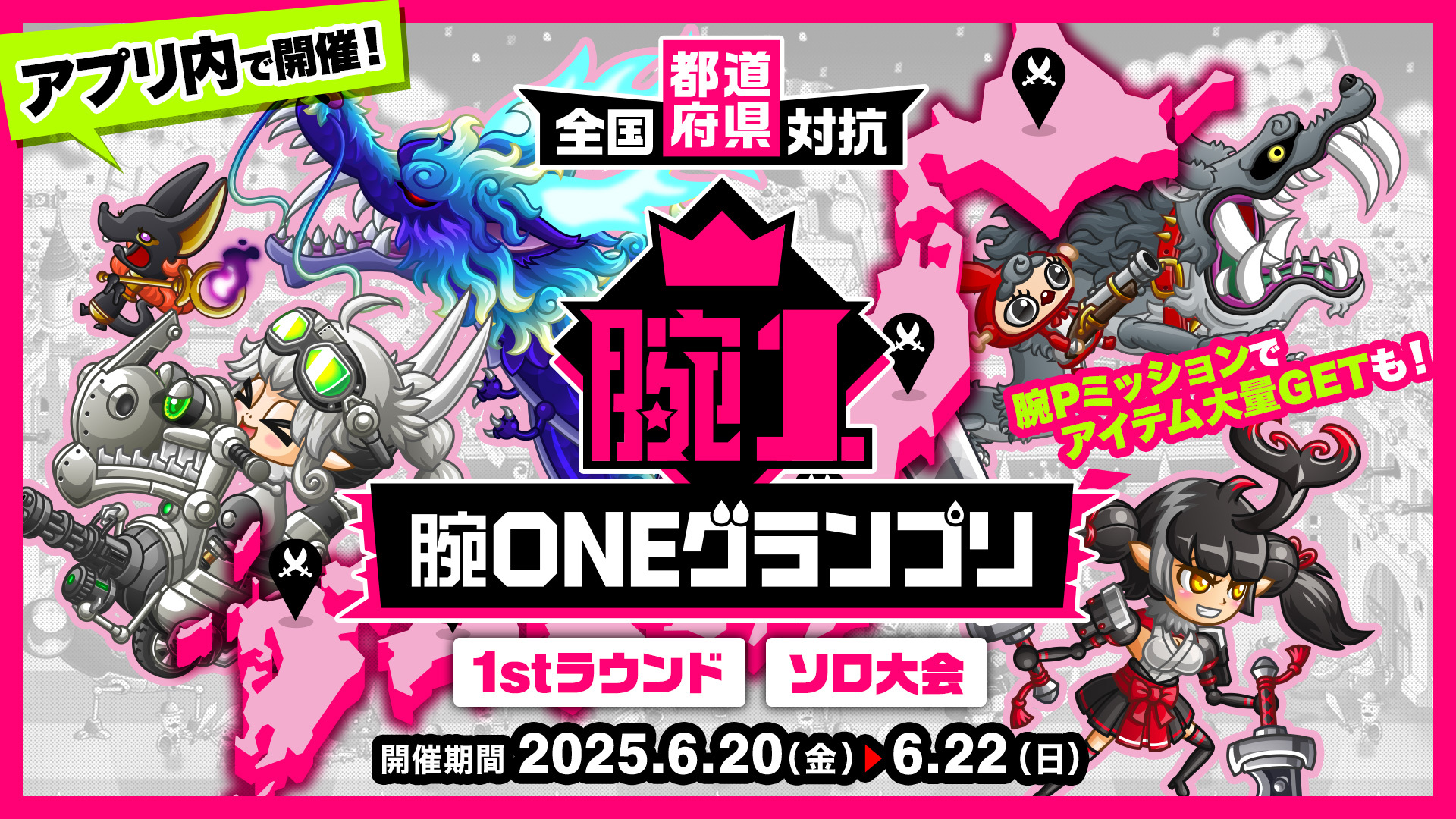 2025年6月20日(金)6:00より、「全国都道府県対抗腕ONEグランプリ 予選1stラウンド[ソロ大会]」をアプリ内で開催いたします。予選は、全『城ドラ』ユーザーが参加可能!今回はアプリ内で現在お住いの都道府県を自己申告し、バトルに挑んでいただく形となります。上級者VS初心者でも選択できるキャラ数や育成による差がなく戦える“腕ONEグランプリ”モードでのバトル。挑むほど達成でき、育成アイテムなど報酬がたっぷりもらえる「腕Pミッション」も同時開催!みなさまのご参加をお待ちしております。