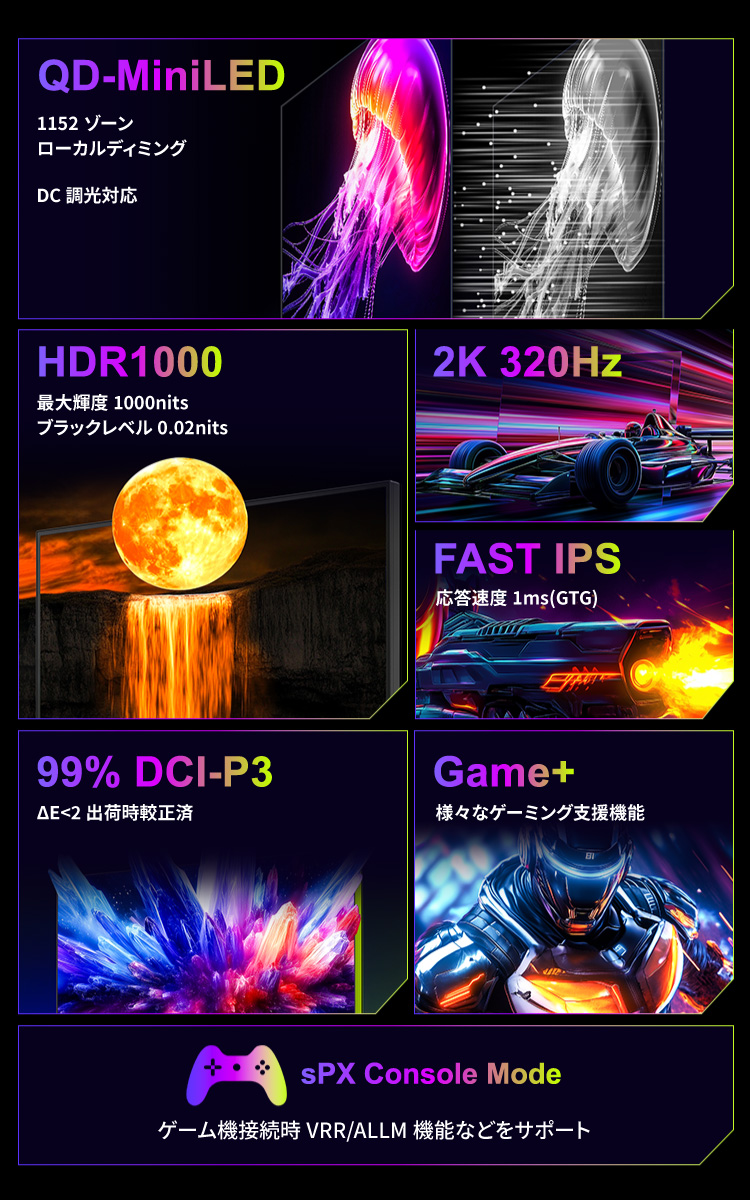Titan Army P275MS+はMini LED、量子ドット技術を搭載し1152ゾーンのローカルディミングに対応した27型320Hz対応のハイエンドゲーミングモニターです。WQHD(2560×1440)の高解像度とDCI-P3 99%、Adobe RGB 99%の広色域に対応します。最大1000nitsの高輝度によりHDR1000相当の性能を持ち、1152ゾーンのローカルディミングは従来のバックライトに比べ、光漏れを抑制しはっきりとした黒色を再現します。HDMI 2.1ポートを2つ備え、最新の家庭用ゲーム機においてVRR(可変リフレッシュレート機能)にも対応しています。また、独自のDyDs(ダイナミックディスプレイ)モードを備え、高リフレッシュレート時の残像感、ブレを低減し更に明瞭な動画表現が可能です。