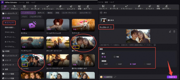 HitPaw Edimakorには、キス以外にも「ハグ」「ハンドハート」「キャラクターに変身」「野菜を洗う猫」など、バリエーション豊かなAIエフェクトが多数収録。