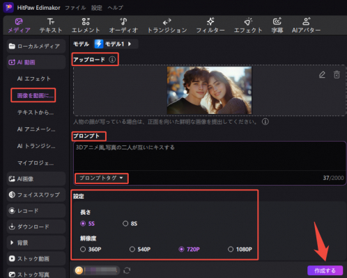 動画の長さ・解像度を指定すれば、完全オリジナルのAIキス動画を作成できます。
