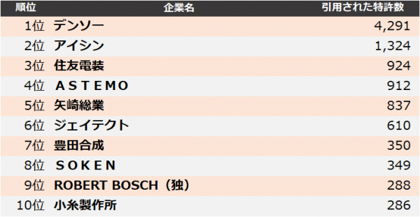 集計の結果、2024年に最も引用された企業は、1位 デンソー、2位 アイシン、3位 住友電装となりました。