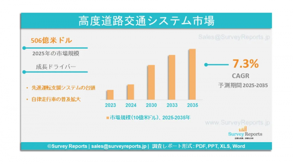 Survey Reports LLCは、2025年6月に「インテリジェント・トランスポート・システム市場セグメンテーション(アプリケーション別(交通管理、公共交通管理、貨物管理、道路安全、自動運転車両)、コンポーネント別(ハードウェア、ソフトウェア、通信システム、サービス)、輸送モード別(道路、鉄道、航空、海上)、最終用途別(政府、商業、個人))」に関する調査報告書を発行しました。- グローバル市場分析、動向、機会、および予測(2025年~2035年)は、インテリジェント・トランスポート・システム市場の見通し評価を提供します。この報告書では、インテリジェント・トランスポート・システム市場の成長要因、市場機会、課題、および脅威を含む、複数の主要な市場動向を強調しています。