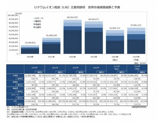 【矢野経済研究所プレスリリース】リチウムイオン電池主要四部材世界市場に関する調査を実施(2025年)~2024年のLiB主要四部材世界市場は前年比73.2%の616億ドルの見込~